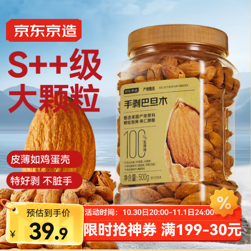 包邮 京东京造手剥大颗粒巴旦木 500g/罐 坚果炒货果干扁桃仁杏仁休闲食品送礼