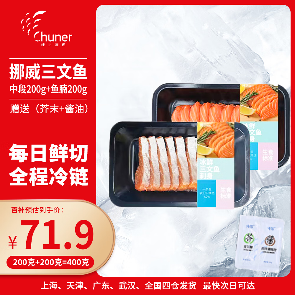 包邮 纯尔挪威三文鱼可生食刺身200g背部 + 200g鱼腩 源头直发 可生食