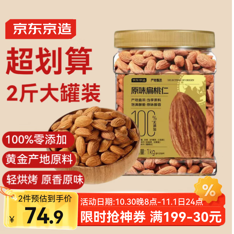 包邮 京东京造原味扁桃仁1kg每日坚果炒货巴旦木仁杏仁量贩0添加零食礼物送礼